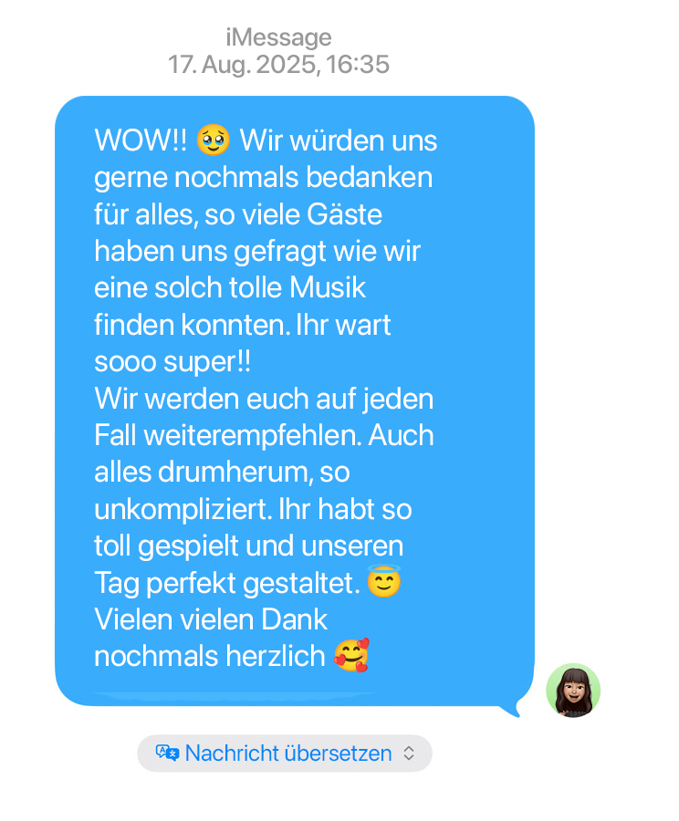Gerne studieren wir 4 Wunschsongs für eure Trauung ein. Wir singen hauptsächlich in Englisch, jedoch hat es auch schon deutsche und italienische Lieder gegeben, die wir für das Brautpaar interpretiert haben.